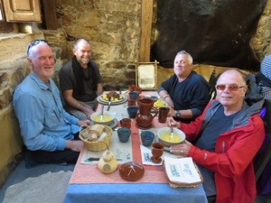 The last 2 days have been very interesting (i.e.: hard as hell). We have walked nearly 60k and climbed 1505m, meaning we have also come down. I don’t mind climbing,I kind of like it, but I hate descending, it hurts my feet. Over the last two days the weather has been perfect, sunrises beautiful, mornings cool and afternoons hot, food really good (stewed pigs ears), the path has been narrow, rocky and steep and the company wonderful.